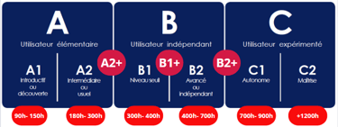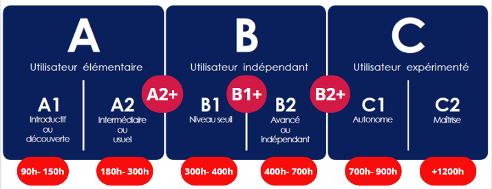 Pour un apprenant, il est estimé à 180 heures de cours minimum (plus travail personnel) le temps pour passer d'un niveau à l’autre.